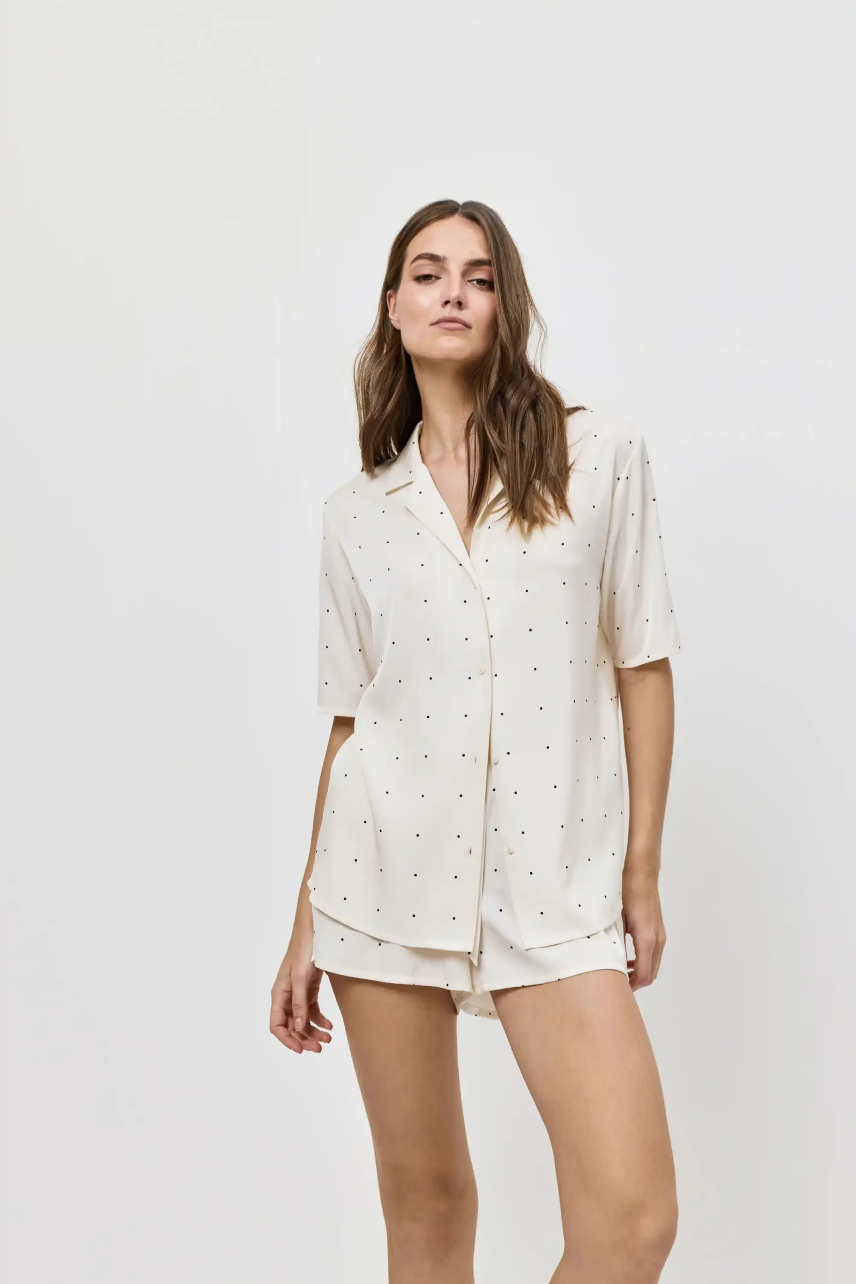 Комплект складається з вільної сорочки з коротким рукавом і прямих шортів, виконаних зі 100% тканої віскози. Матеріал дихаючий, шовковисто-м’який на дотик і красиво лягає по фігурі, забезпечуючи відчуття легкості протягом усього дня або ночі.