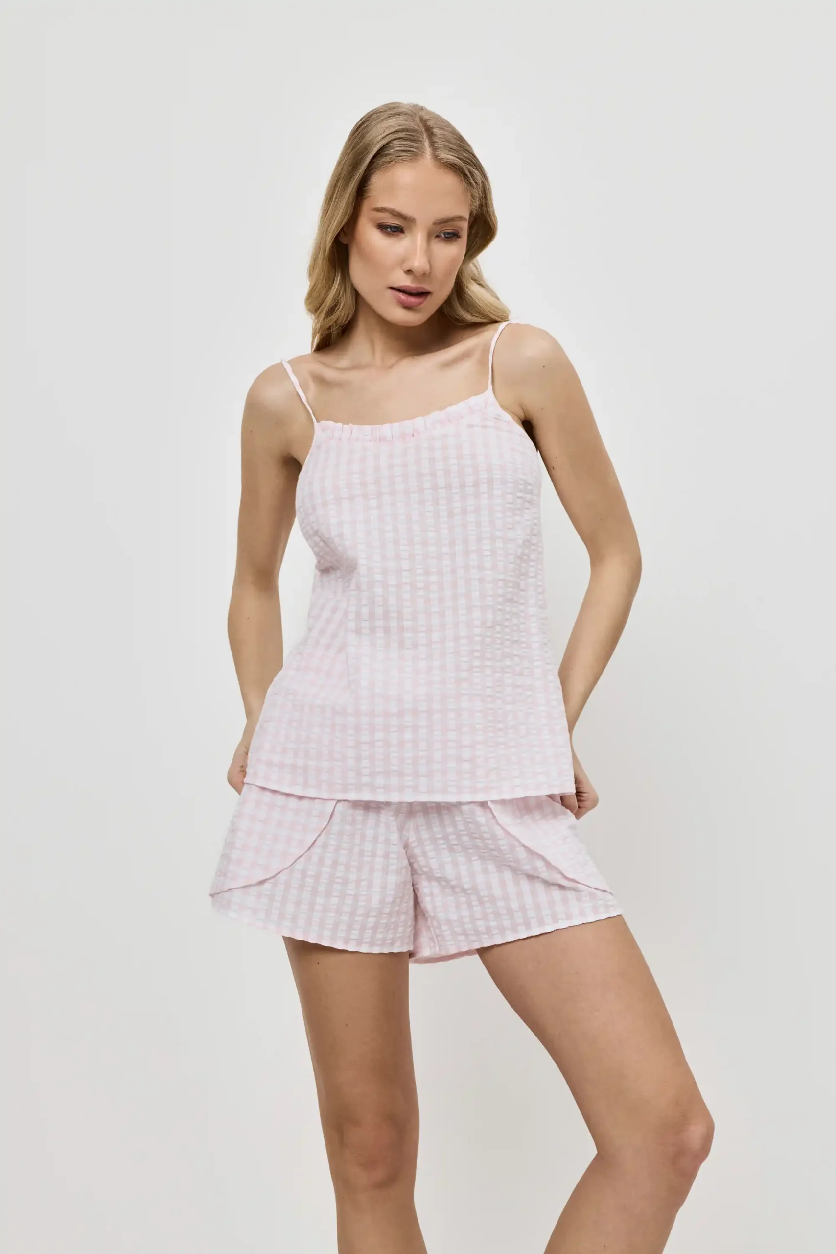 Сорочка з коротким рукавом, класичним коміром і акуратною застібкою на ґудзики додає образу витонченості, а штани з еластичним поясом і регулюванням забезпечують ідеальну посадку. Практичні кишені та контрастний кант завершують продуманий до деталей дизайн.